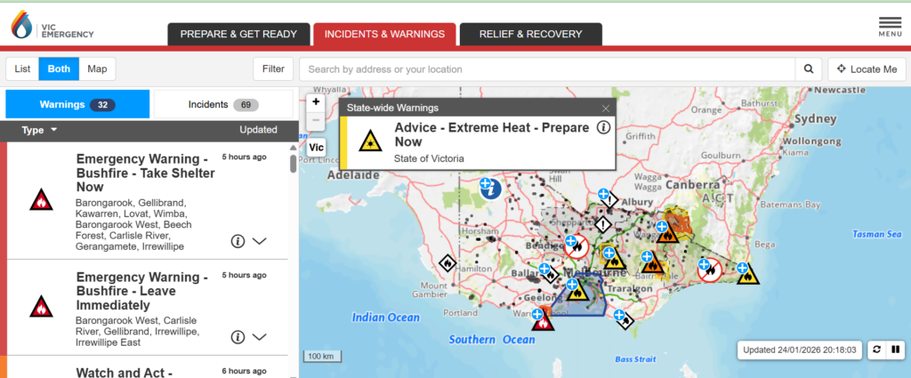 The latest map from VicEmergency shows multiple Emergency Warnings in effect across Victoria, with “Take Shelter Now” and “Leave Immediately” alerts issued for communities near the Otways bushfire. Authorities say extreme heat and gusting winds are increasing fire danger statewide.