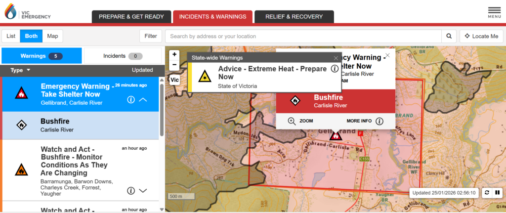 Update (Victoria): As of 2:56am AEDT on 25 January 2026, the VicEmergency map shows an active Emergency Warning – Take Shelter Now for the bushfire at Carlisle River, with the warning zone covering Gellibrand and surrounding rural areas. The image highlights the defined fire perimeter and exclusion zone, while a state-wide Extreme Heat – Prepare Now advisory remains in effect as hot conditions continue to increase bushfire risk.