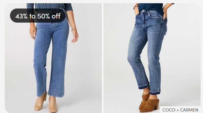 COCO + CARMEN’s EverStretch denim is designed for all-day comfort without compromising style. Made from a soft blend of cotton, polyester, viscose, and spandex, these jeans feature a flexible four-way stretch that adapts to movement while maintaining shape. The collection includes a wide variety of styles such as ankle, skinny, flare, straight, and wide-leg fits, along with coordinating skirts and fringe-detailed jackets. Sizes range from S (2–4) to XXL (18–20), offering inclusive sizing for different body types.