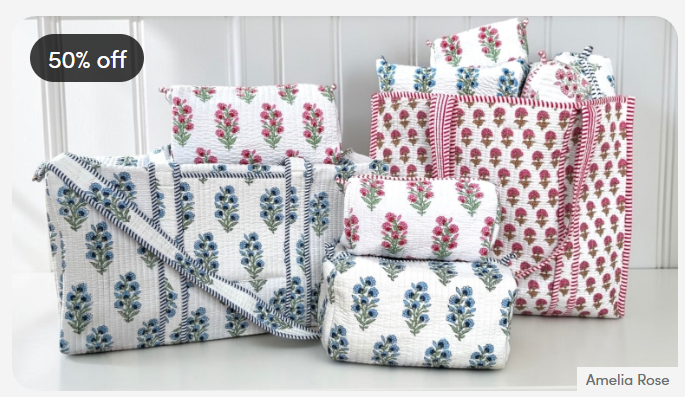 Amelia Rose offers quilted accessories that balance style and practicality. Each piece is made from 100% cotton with hand block-printed designs, giving every bag a unique, artisan feel. The collection includes spacious duffle bags, everyday totes, and compact cosmetic pouches, all designed to keep essentials organized while remaining lightweight and flexible. The coordinated patterns also allow for mixing and matching sets for travel or daily use.
