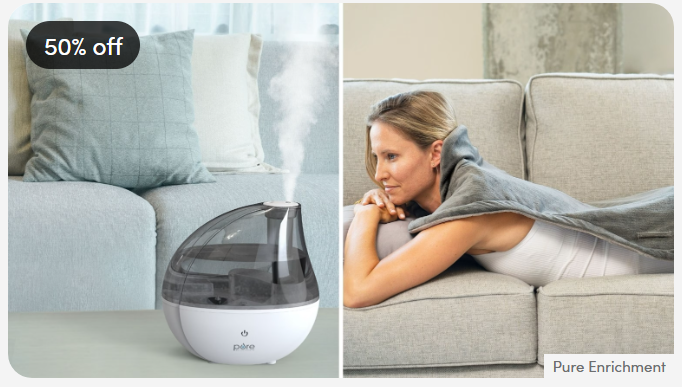Pure Enrichment offers popular wellness essentials, including the MistAire Silver Ultrasonic Cool Mist Humidifier, designed to quietly moisturize indoor air for up to 25 hours. Heating pads for back, neck, and muscle relief are also included, along with air purifiers, fabric steamers, and more.