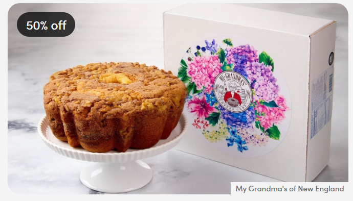 My Grandma’s of New England offers rich, moist coffee cakes made with farm-fresh eggs, pure bourbon vanilla and cultured sour cream. The classic Cinnamon Walnut Coffee Cake is hand-poured and double-layered with cinnamon streusel and California walnuts.