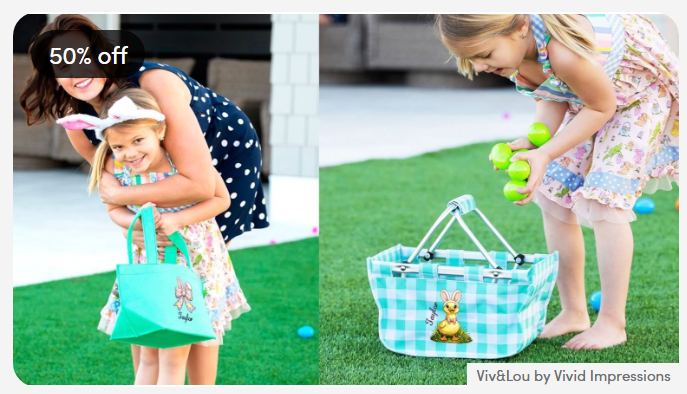 Viv&Lou by Vivid Impressions offers personalized Easter baskets designed to make seasonal gifting more special. Options include felt, canvas and market totes decorated with playful motifs like bunnies, eggs and carrots.