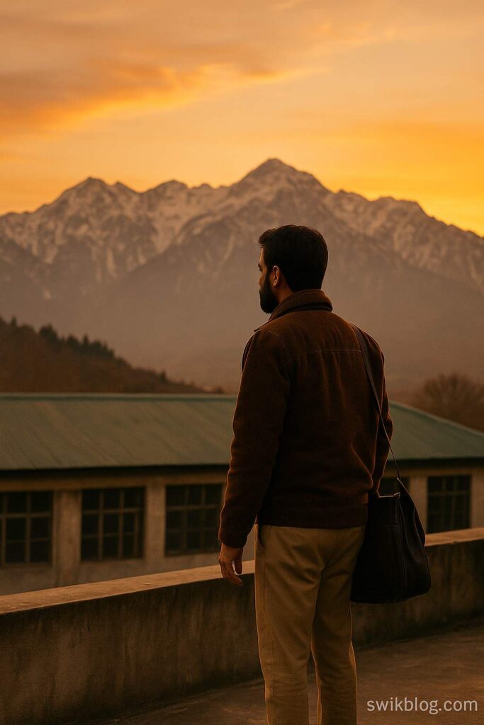 One evening, standing on the school rooftop at sunset, he watched the snow-brushed mountains glowing gold.